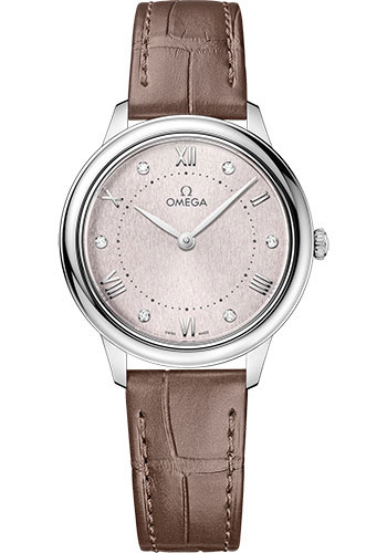 30 mm steel case, domed scratch-resistant sapphire crystal with anti-reflective treatment inside, pvd rose silvery dial with a stamped random vertical pattern in a sun-brushed finish, Calibre 4061 quartz movement, approximately 48 months of power reserve, shimmering taupe brown leather strap. Water resistant to 30 metres (100 feet).