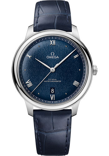 40 mm steel case, transparent back, domed scratch-resistant sapphire crystal with anti-reflective treatment inside, domed pvd dark blue dial with a stamped random vertical pattern in a sun-brushed finish, Omega 8800 self-winding chronometer movement with date, dark blue leather strap. Water resistant to 30 metres (100 feet).
