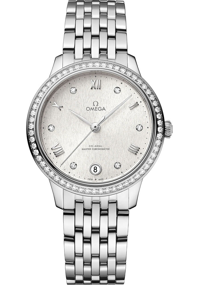 34 mm steel case with anti-magnetic protection, diamond-paved bezel, domed scratch-resistant sapphire crystal with anti-reflective treatment inside, silvery dial with a stamped random vertical pattern in a sun-brushed finish, Omega 8800 self winding chronometer movement, approximately 55 hours of power reserve, stainless steel bracelet. Water resistant to 30 metres (100 feet).