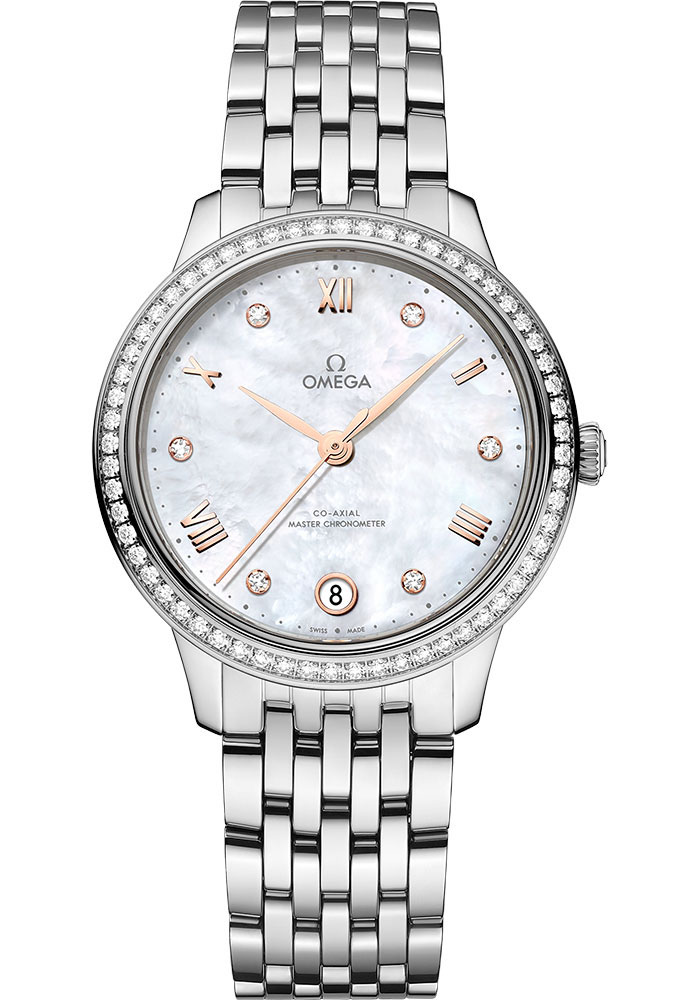 34 mm steel case with anti-magnetic protection, diamond-paved bezel, domed scratch-resistant sapphire crystal with anti-reflective treatment inside, white dial crafted from white mother-of-pearl, Omega 8800 self winding chronometer movement, approximately 55 hours of power reserve, stainless steel bracelet. Water resistant to 30 metres (100 feet).