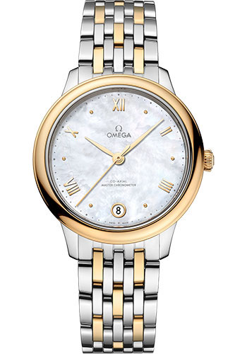 34 mm steel and yellow gold case, transparent back, domed scratch-resistant sapphire crystal with anti-reflective treatment inside, white dial, Omega 8800 self-winding chronometer movement with date, stainless steel and yellow gold bracelet. Water resistant to 30 metres (100 feet).
