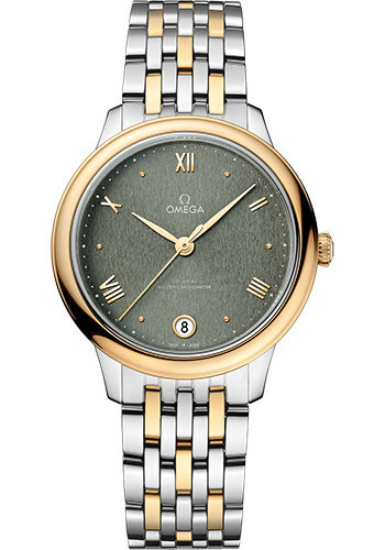 34 mm steel and yellow gold case, transparent back, domed scratch-resistant sapphire crystal with anti-reflective treatment inside, pvd matchgreen dial with a stamped random vertical pattern in a sun-brushed finish, Omega 8800 self-winding chronometer movement with date, stainless steel and yellow gold bracelet. Water resistant to 30 metres (100 feet).