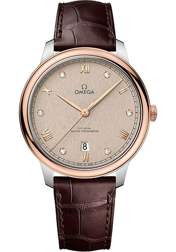40 mm steel and sedna gold case, transparent back, domed scratch-resistant sapphire crystal with anti-reflective treatment inside, flat pvd linen dial with a stamped random vertical pattern withn opaline finish, Omega 8800 self-winding chronometer movement with date, brown leather strap. Water resistant to 30 metres (100 feet).