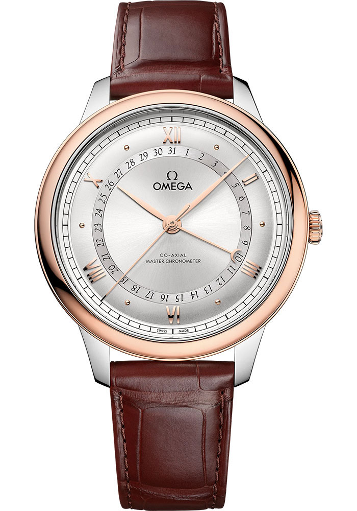 42 mm steel and sedna gold case with anti-magnetic protection, domed scratch-resistant sapphire crystal with anti-reflective treatment inside, opaline silvery dial, Omega 8936 self winding chronometer movement, approximately 60 hours of power reserve, brown leather strap. Water resistant to 30 metres (100 feet).