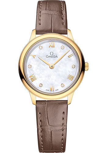 27.5 mm yellow gold case, domed scratch-resistant sapphire crystal with anti-reflective treatment inside, white dial, Calibre 4061 quartz movement, approximately 48 months of power reserve, shimmering taupe brown leather strap. Water resistant to 30 metres (100 feet).