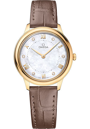 30 mm yellow gold case, domed scratch-resistant sapphire crystal with anti-reflective treatment inside, white dial, Calibre 4061 quartz movement, approximately 48 months of power reserve, shimmering taupe brown leather strap. Water resistant to 30 metres (100 feet).