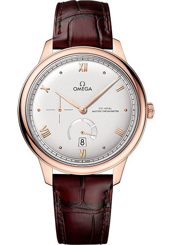 41 mm sedna gold case, transparent back, scratch-resistant sapphire crystal with anti-reflective treatment inside, domed silvery dial with a crystal finish, Omega 8810 self-winding chronometer movement with small seconds and date, approximately Power reserve indicator of power reserve, burgundy leather strap. Water resistant to 30 metres (100 feet).
