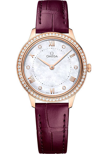 30 mm sedna gold case, diamond-paved bezel, domed scratch-resistant sapphire crystal with anti-reflective treatment inside, white dial, Calibre 4061 quartz movement, approximately 48 months of power reserve, shimmering burgundy leather strap. Water resistant to 30 metres (100 feet).