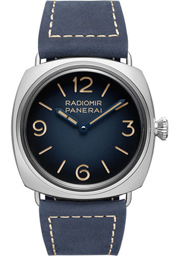 45mm AISI 316L patina steel case, patina steel bezel, degradé blue dial with luminous arabic numerals and hour markers, P.6000 calibre hand-wound movement with hours, minutes, approximately 3 days of power reserve, blue scamosciato strap with ecru stitching. Water resistant to 10 bar (~100 metres).