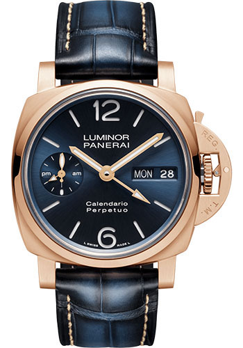 44mm brushed Goldtech case, sapphire crystal back, polished Goldtech bezel, blue sun-brushed dial with luminous arabic numerals and hour markers, day of the week, date at 3 o'clock, seconds and 24h indicator at 9 o’clock, Panerai P.4100 calibre automatic movement with hours, minutes, small seconds, date, day, month, year, leap year, gmt, power reserve indicator, perpetual calendar, seconds reset, approximately 3 days of power reserve, blue alligator strap with ecru stitching. Water resistant to 5 bar (~50 metres).