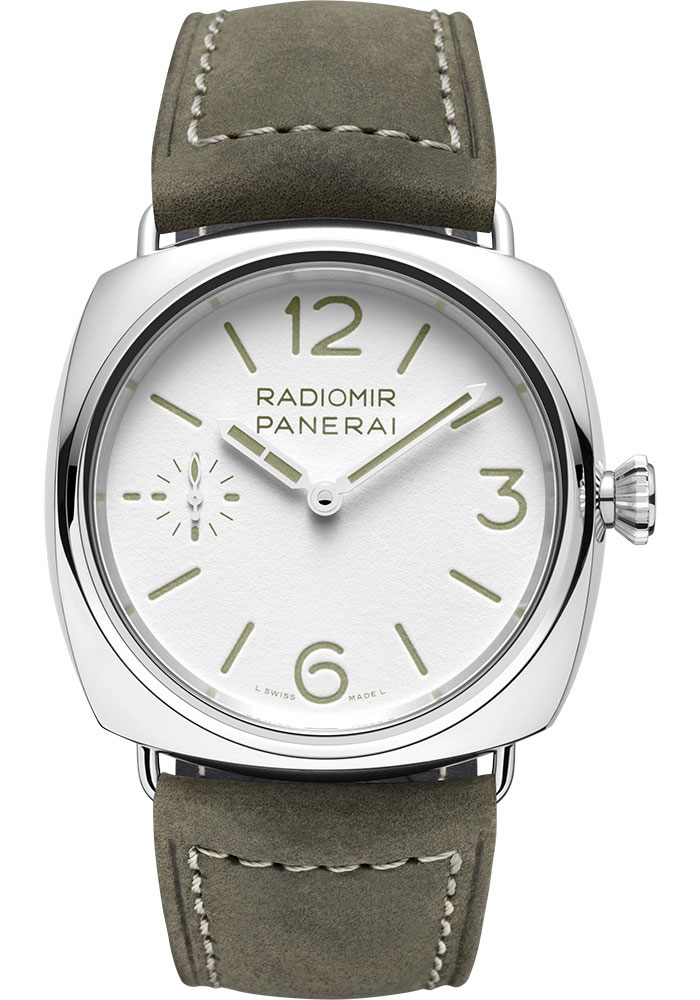 45mm polished steel case, white grainy dial with luminous arabic numerals and hour markers, with luminous arabic numerals and hour markers, small seconds at 9 o'clock, P.6000 calibre hand-wound movement with minutes, small seconds, hours, black scamosciato strap with ecrue. Water resistant to 10.0 bar (~100.0 metres).