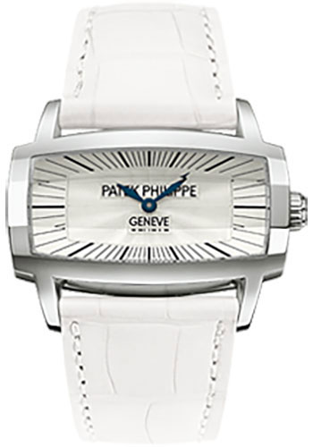 37.2 mm x 22.4 mm 18K white gold case, white mother-of-pearl dial, caliber E 15 quartz movement, white alligator strap. Water resistant to 30 m.