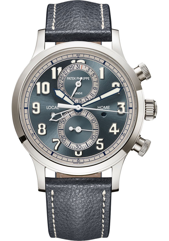 42 mm white gold case, sapphire crystal back, sunburst blue-gray dial, Caliber CH 28-520 C FUS self-winding mechanical movement with flyback chronograph, central chronograph hand, 60-minute counter, two time zones: local and home timeindication, day/night indication for local time and home time in apertures, date coupled with local time by hand, approximately 45-55 hours of power reserve, grained navy blue calfskin strap, clevis prong buckle. Water resistant to 30 m.