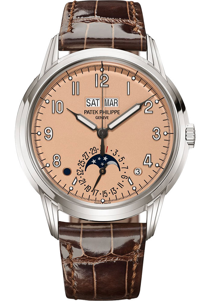 40 mm white gold case, interchangeable solid and sapphire crystal back, rose-gilt opaline dial with charcoal gray gold applied numerals with luminescent coating, Caliber 324 S Q self-winding mechanical movement with perpetual calendar, day, month, leap year and day/night indication in apertures, date by hand, moon phases, sweep seconds, approximately 35-45 hours of power reserve, shiny chocolate brown alligator leather strap with square scales, fold-over buckle. Water resistant to 30 m.