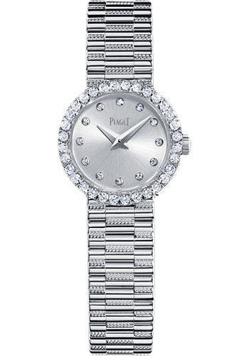 19 mm 18K white gold case set with 32 brilliant-cut diamonds (approx. 0.45 ct), 2.5 mm thick, silvered dial with dot hour markers, gold bracelet, integrated buckle. Water resistant to 3 atm.