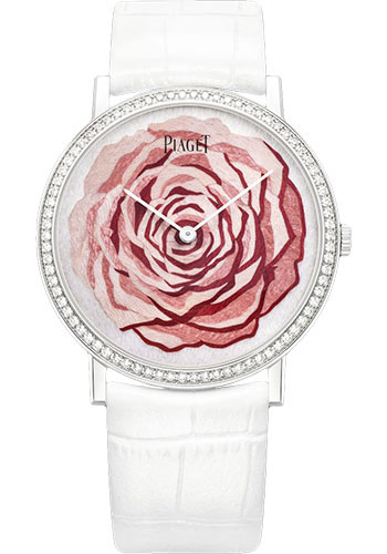 38 mm 18K white gold case set with 78 brilliant-cut diamonds (approx. 0.71 ct), 7.0 mm thick, pink, white marquetry dial, 430P hand-wound mechanical movement with minutes, hours, approximately 43 hours of power reserve, white alligator strap, ardillon buckle. Water resistant to 3 atm.