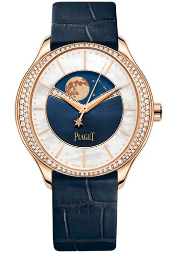 36 mm 18K rose gold case set with 126 brilliant-cut diamonds (approx. 0.65 ct), 9.9 mm thick, sapphire crystal back, bezel set with gradient diamonds, gem-set dial, 584P automatic mechanical movement with seconds, hours, minutes, moon-phase indicator at 12 o'clock, approximately 42 hours of power reserve, blue alligator strap, ardillon buckle. Water resistant to 03 ATM.
