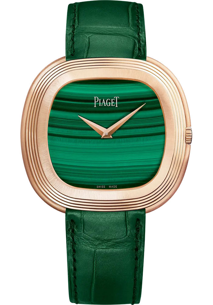 45 x 43 mm rose gold case, 7.6 mm thick, green dial, US self-winding movement, green alligator strap, gold ardillon buckle. Water resistant to 3 bar.