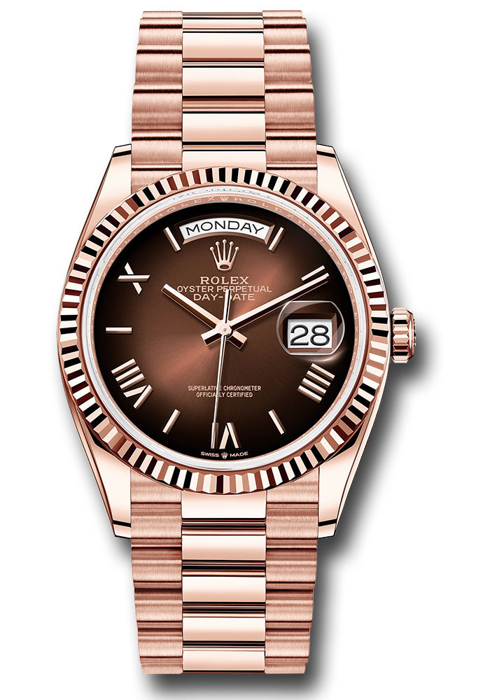 36mm 18K Everose gold case, screw-down back, screw-down crown with twinlock double waterproofness system, fluted bezel, scratch-resistant sapphire crystal with cyclops lens over the date, brown ombré dial, bevelled deconstructed Roman numerals, Rolex calibre 3255 perpetual self-winding movement with centre hour, minute and seconds hands, instantaneous day and date in apertures, secure rapid-setting, and stop-seconds for exact time setting, approximately 70 hours of power reserve, President bracelet with semi-circular three-piece links, concealed folding Crownclasp buckle. Waterproof to 100 metres / 330 feet.