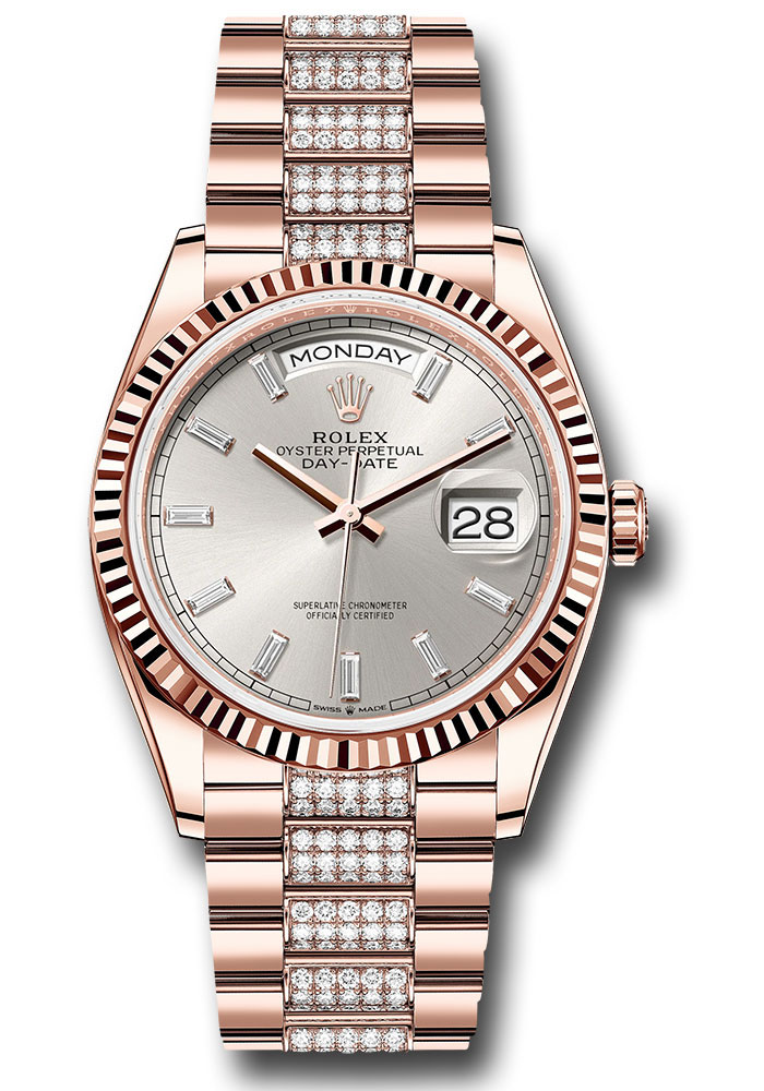 36mm 18K Everose gold case, screw-down back, screw-down crown with twinlock double waterproofness system, fluted bezel, scratch-resistant sapphire crystal with cyclops lens over the date, silver dial, 10 baguette-cut hour markers, Rolex calibre 3255 perpetual self-winding movement with centre hour, minute and seconds hands, instantaneous day and date in apertures, secure rapid-setting, and stop-seconds for exact time setting, approximately 70 hours of power reserve, diamond-set President bracelet, concealed folding Crownclasp buckle. Waterproof to 100 metres / 330 feet.