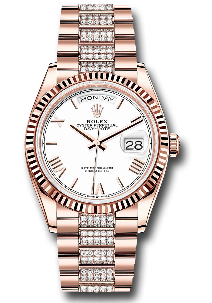 36mm 18K Everose gold case, screw-down back, screw-down crown with twinlock double waterproofness system, fluted bezel, scratch-resistant sapphire crystal with cyclops lens over the date, white dial, bevelled deconstructed Roman numerals, Rolex calibre 3255 perpetual self-winding movement with centre hour, minute and seconds hands, instantaneous day and date in apertures, secure rapid-setting, and stop-seconds for exact time setting, approximately 70 hours of power reserve, diamond-set President bracelet, concealed folding Crownclasp buckle. Waterproof to 100 metres / 330 feet.