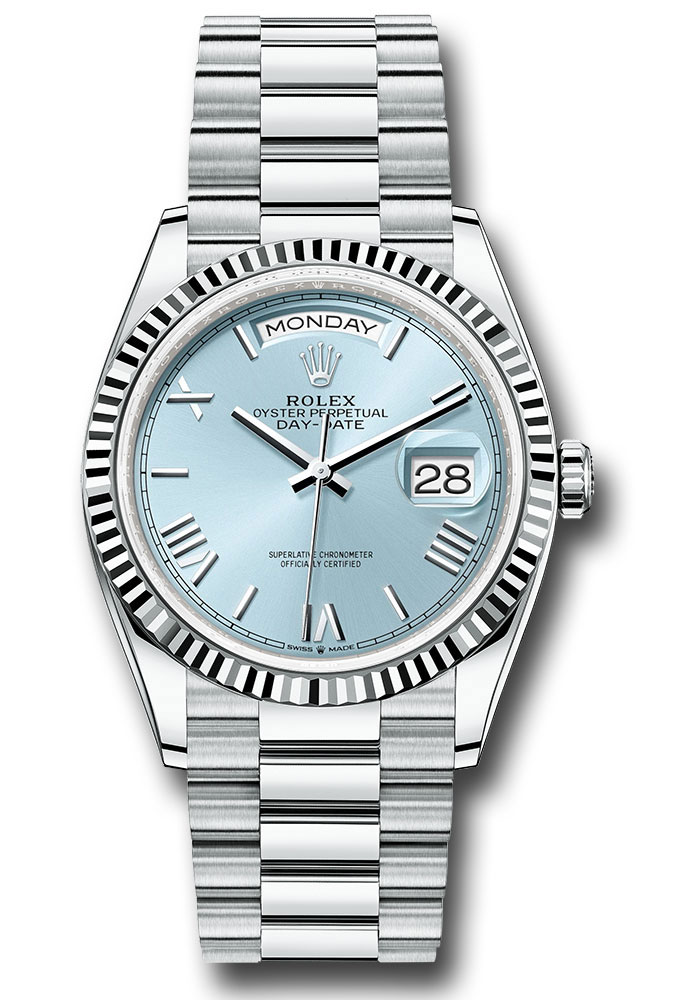 36mm platinum case, screw-down back, screw-down crown with twinlock double waterproofness system, fluted bezel, scratch-resistant sapphire crystal with cyclops lens over the date, ice blue dial, bevelled deconstructed Roman numerals, Rolex calibre 3255 perpetual self-winding movement with centre hour, minute and seconds hands, instantaneous day and date in apertures, secure rapid-setting, and stop-seconds for exact time setting, approximately 70 hours of power reserve, President bracelet with semi-circular three-piece links, concealed folding Crownclasp buckle. Waterproof to 100 metres / 330 feet.