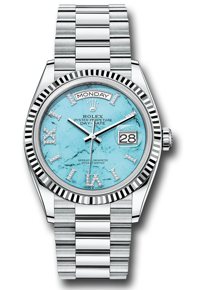 36mm platinum case, screw-down back, screw-down crown with twinlock double waterproofness system, fluted bezel, scratch-resistant sapphire crystal with cyclops lens over the date, turquoise dial, diamond-set index and Roman numeral 6 and 9 hour markers , index hour markers set with 32 diamonds and Roman VI and IX set with 24 diamonds, Rolex calibre 3255 perpetual self-winding movement with centre hour, minute and seconds hands, instantaneous day and date in apertures, unrestricted rapid-setting, and stop-seconds for precise time setting, approximately 70 hours of power reserve, President bracelet with semi-circular three-piece links, concealed folding Crownclasp buckle. Waterproof to 100 metres / 330 feet.