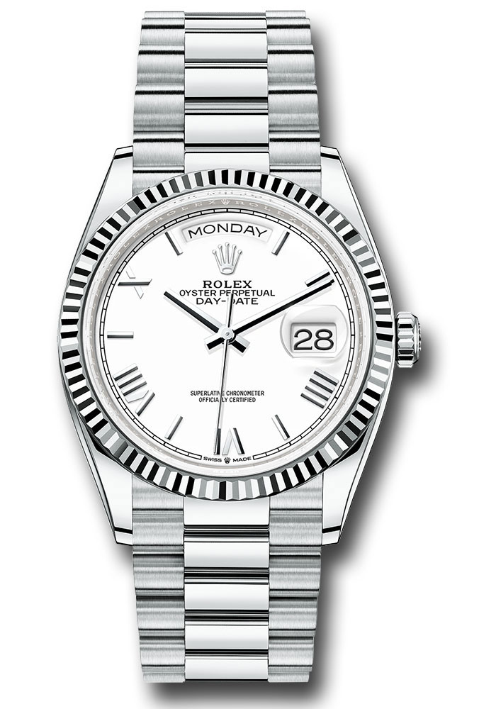 36mm platinum case, screw-down back, screw-down crown with twinlock double waterproofness system, fluted bezel, scratch-resistant sapphire crystal with cyclops lens over the date, white dial, bevelled deconstructed Roman numerals, Rolex calibre 3255 perpetual self-winding movement with centre hour, minute and seconds hands, instantaneous day and date in apertures, secure rapid-setting, and stop-seconds for exact time setting, approximately 70 hours of power reserve, President bracelet with semi-circular three-piece links, concealed folding Crownclasp buckle. Waterproof to 100 metres / 330 feet.