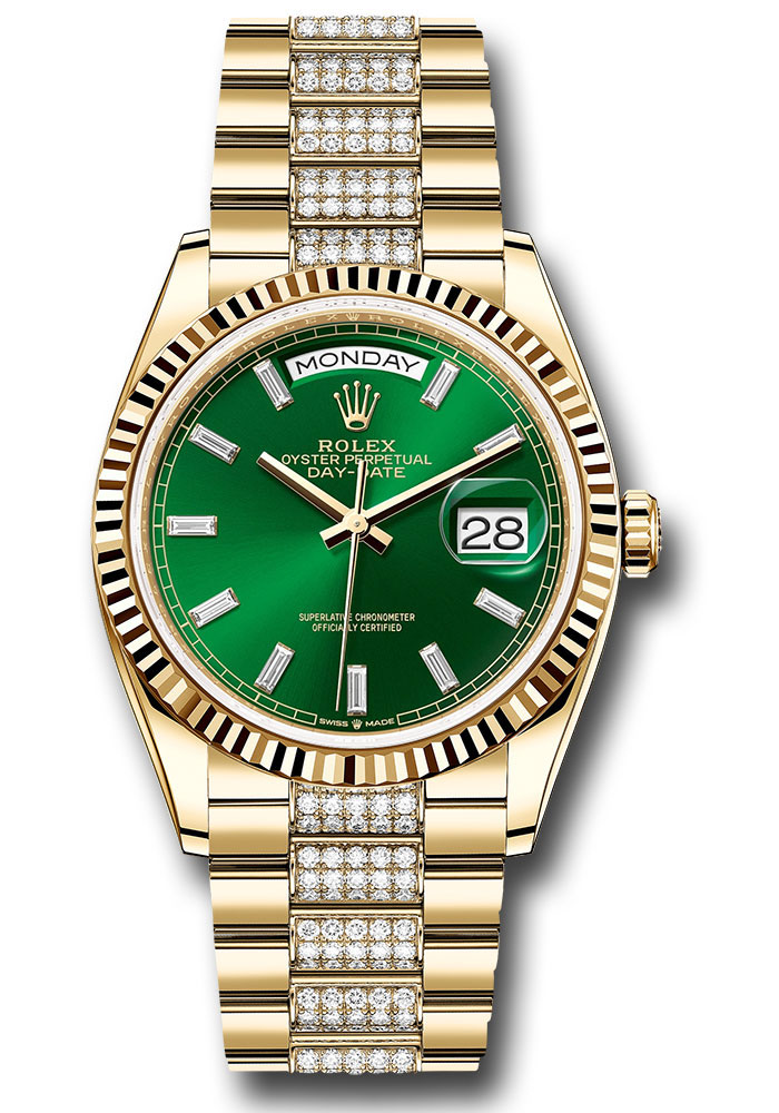 36mm 18K yellow gold case, screw-down back, screw-down crown with twinlock double waterproofness system, fluted bezel, scratch-resistant sapphire crystal with cyclops lens over the date, bright green dial, 10 baguette-cut hour markers, Rolex calibre 3255 perpetual self-winding movement with centre hour, minute and seconds hands, instantaneous day and date in apertures, secure rapid-setting, and stop-seconds for exact time setting, approximately 70 hours of power reserve, diamond-set President bracelet, concealed folding Crownclasp buckle. Waterproof to 100 metres / 330 feet.