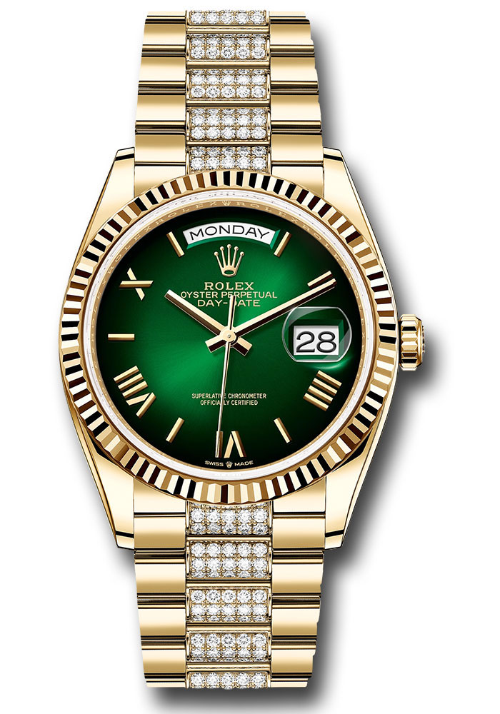 36mm 18K yellow gold case, screw-down back, screw-down crown with twinlock double waterproofness system, fluted bezel, scratch-resistant sapphire crystal with cyclops lens over the date, green ombré dial, bevelled deconstructed Roman numerals, Rolex calibre 3255 perpetual self-winding movement with centre hour, minute and seconds hands, instantaneous day and date in apertures, secure rapid-setting, and stop-seconds for exact time setting, approximately 70 hours of power reserve, diamond-set President bracelet, concealed folding Crownclasp buckle. Waterproof to 100 metres / 330 feet.