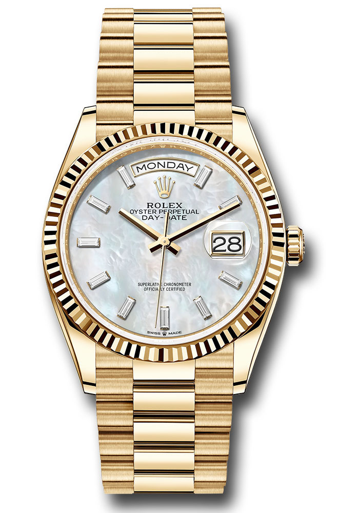 36mm 18K yellow gold case, screw-down back, screw-down crown with twinlock double waterproofness system, fluted bezel, scratch-resistant sapphire crystal with cyclops lens over the date, white mother-of-pearl dial, 10 baguette-cut hour markers, Rolex calibre 3255 perpetual self-winding movement with centre hour, minute and seconds hands, instantaneous day and date in apertures, secure rapid-setting, and stop-seconds for exact time setting, approximately 70 hours of power reserve, President bracelet with semi-circular three-piece links, concealed folding Crownclasp buckle. Waterproof to 100 metres / 330 feet.