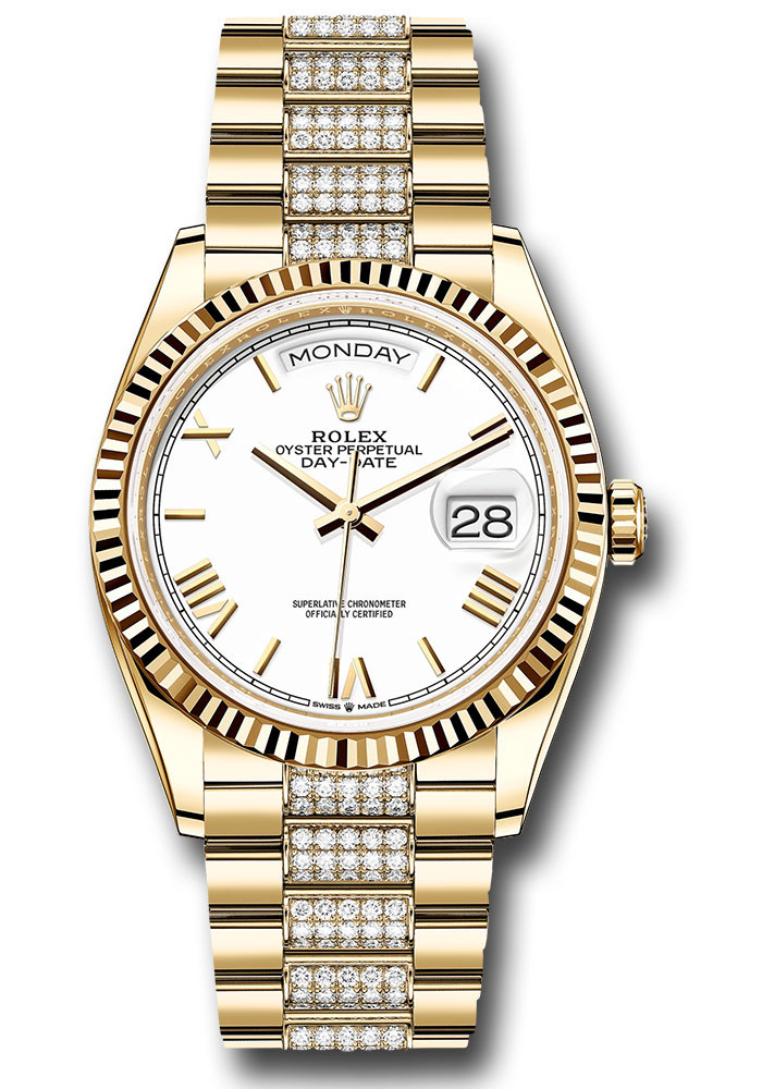 36mm 18K yellow gold case, screw-down back, screw-down crown with twinlock double waterproofness system, fluted bezel, scratch-resistant sapphire crystal with cyclops lens over the date, white dial, bevelled deconstructed Roman numerals, Rolex calibre 3255 perpetual self-winding movement with centre hour, minute and seconds hands, instantaneous day and date in apertures, secure rapid-setting, and stop-seconds for exact time setting, approximately 70 hours of power reserve, diamond-set President bracelet, concealed folding Crownclasp buckle. Waterproof to 100 metres / 330 feet.