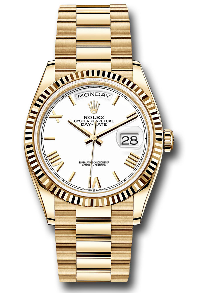 36mm 18K yellow gold case, screw-down back, screw-down crown with twinlock double waterproofness system, fluted bezel, scratch-resistant sapphire crystal with cyclops lens over the date, white dial, bevelled deconstructed Roman numerals, Rolex calibre 3255 perpetual self-winding movement with centre hour, minute and seconds hands, instantaneous day and date in apertures, secure rapid-setting, and stop-seconds for exact time setting, approximately 70 hours of power reserve, President bracelet with semi-circular three-piece links, concealed folding Crownclasp buckle. Waterproof to 100 metres / 330 feet.