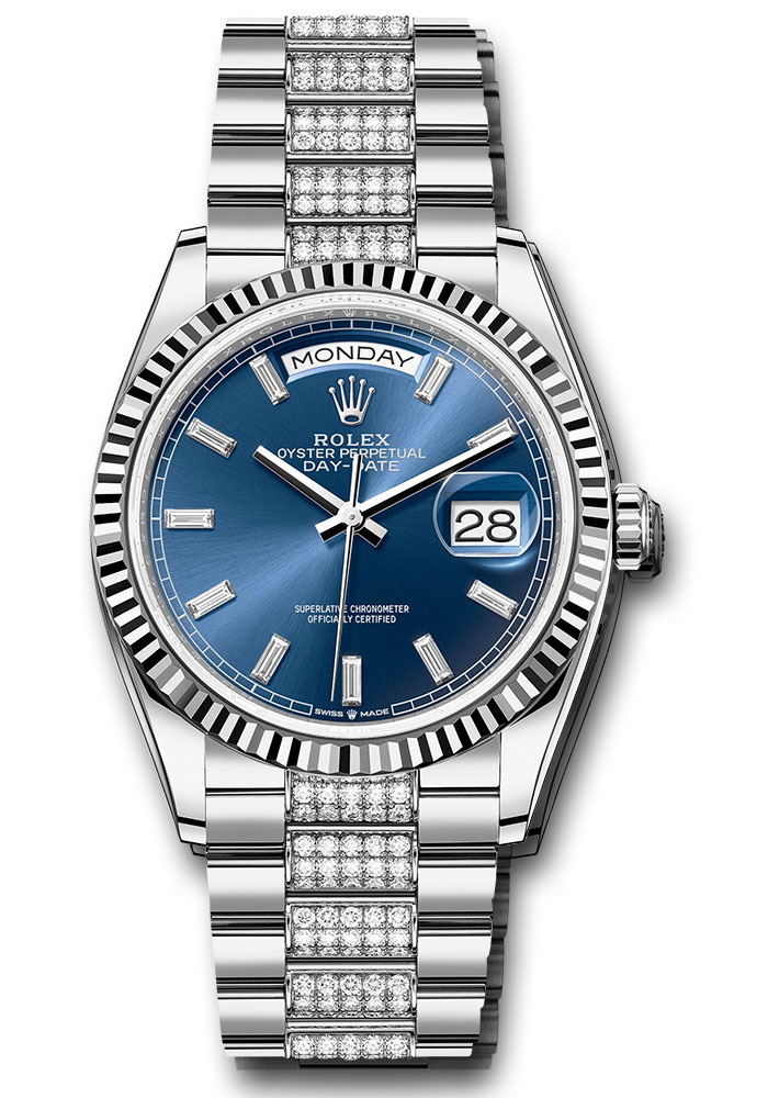 36mm 18K white gold case, screw-down back, screw-down crown with twinlock double waterproofness system, fluted bezel, scratch-resistant sapphire crystal with cyclops lens over the date, bright blue dial, 10 baguette-cut hour markers, Rolex calibre 3255 perpetual self-winding movement with centre hour, minute and seconds hands, instantaneous day and date in apertures, secure rapid-setting, and stop-seconds for exact time setting, approximately 70 hours of power reserve, diamond-set President bracelet, concealed folding Crownclasp buckle. Waterproof to 100 metres / 330 feet.