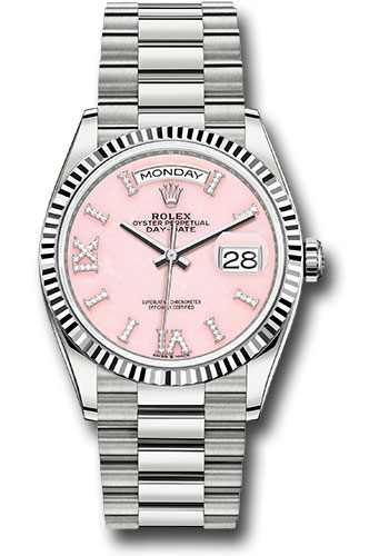 36mm 18K white gold case, screw-down back, screw-down crown with twinlock double waterproofness system, fluted bezel, scratch-resistant sapphire crystal with cyclops lens over the date, pink opal dial, diamond set index hour markes with Roman 6 and 9, Rolex calibre 3255 perpetual self-winding movement with centre hour, minute and seconds hands, instantaneous day and date in apertures, unrestricted rapid-setting, and stop-seconds for precise time setting, approximately 70 hours of power reserve, 18K white gold President bracelet with semi-circular three-piece links, concealed folding Crownclasp buckle. Waterproof to 100 meters.