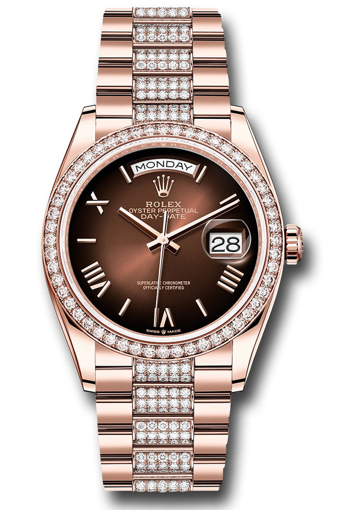 36mm 18K Everose gold case, screw-down back, screw-down crown with twinlock double waterproofness system, diamond bezel, scratch-resistant sapphire crystal with cyclops lens over the date, brown ombré dial, bevelled deconstructed Roman numerals, Rolex calibre 3255 perpetual self-winding movement with centre hour, minute and seconds hands, instantaneous day and date in apertures, secure rapid-setting, and stop-seconds for exact time setting, approximately 70 hours of power reserve, diamond-set President bracelet, concealed folding Crownclasp buckle. Waterproof to 100 metres / 330 feet.