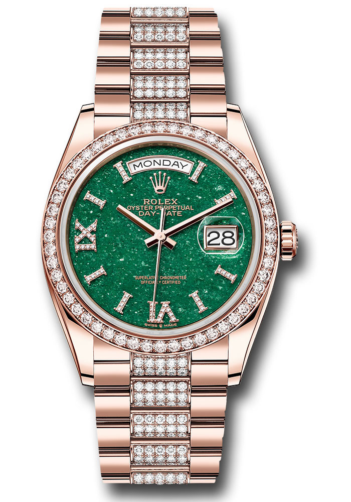 36mm 18K Everose gold case, screw-down back, screw-down crown with twinlock double waterproofness system, diamond bezel, scratch-resistant sapphire crystal with cyclops lens over the date, green aventurine dial, diamond-set index and Roman numeral 6 and 9 hour markers , index hour markers set with 32 diamonds and Roman VI and IX set with 24 diamonds, Rolex calibre 3255 perpetual self-winding movement with centre hour, minute and seconds hands, instantaneous day and date in apertures, unrestricted rapid-setting, and stop-seconds for precise time setting, approximately 70 hours of power reserve, diamond-set President bracelet, concealed folding Crownclasp buckle. Waterproof to 100 metres / 330 feet.