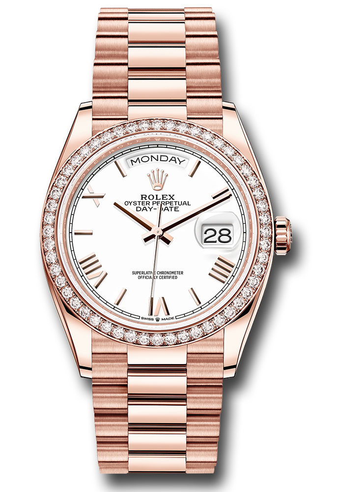 Rolex Style No: 128345rbr wbdrp Rolex Everose Gold Day-Date 36 Watch - Diamond Bezel - White Roman Dial - President Bracelet