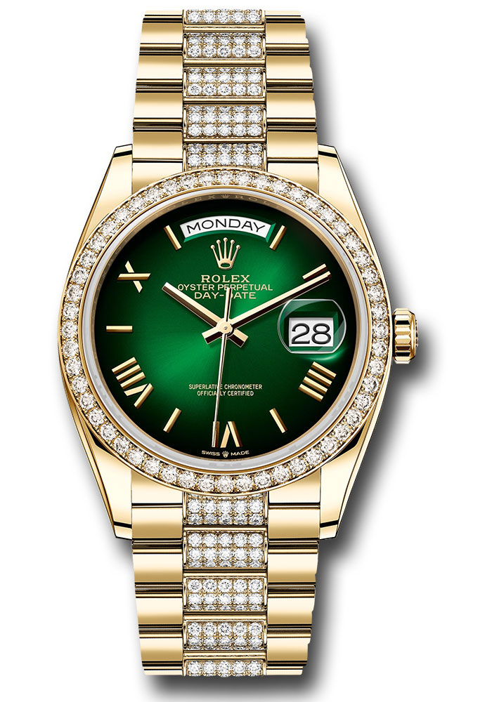 36mm 18K yellow gold case, screw-down back, screw-down crown with twinlock double waterproofness system, diamond bezel, scratch-resistant sapphire crystal with cyclops lens over the date, green ombré dial, bevelled deconstructed Roman numerals, Rolex calibre 3255 perpetual self-winding movement with centre hour, minute and seconds hands, instantaneous day and date in apertures, secure rapid-setting, and stop-seconds for exact time setting, approximately 70 hours of power reserve, diamond-set President bracelet, concealed folding Crownclasp buckle. Waterproof to 100 metres / 330 feet.
