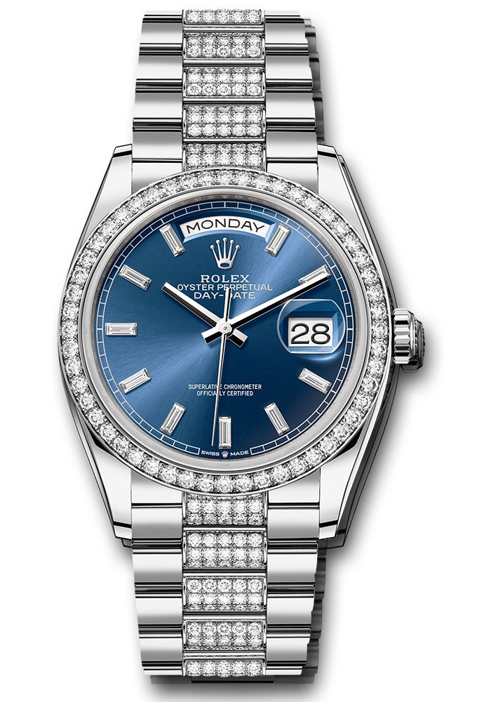 36mm 18K white gold case, screw-down back, screw-down crown with twinlock double waterproofness system, diamond bezel, scratch-resistant sapphire crystal with cyclops lens over the date, bright blue dial, 10 baguette-cut hour markers, Rolex calibre 3255 perpetual self-winding movement with centre hour, minute and seconds hands, instantaneous day and date in apertures, secure rapid-setting, and stop-seconds for exact time setting, approximately 70 hours of power reserve, diamond-set President bracelet, concealed folding Crownclasp buckle. Waterproof to 100 metres / 330 feet.