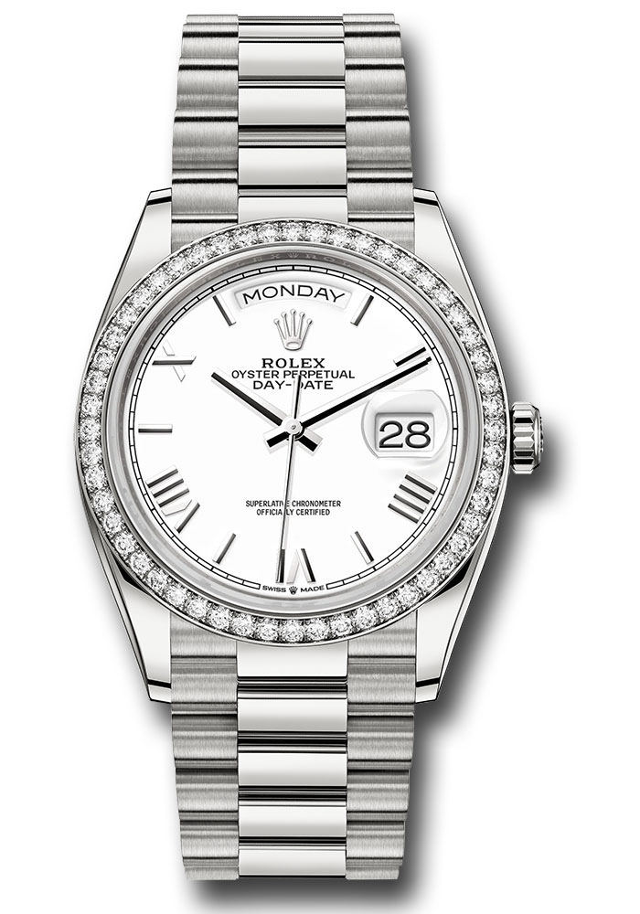 36mm 18K white gold case, screw-down back, screw-down crown with twinlock double waterproofness system, diamond bezel, scratch-resistant sapphire crystal with cyclops lens over the date, white dial, bevelled deconstructed Roman numerals, Rolex calibre 3255 perpetual self-winding movement with centre hour, minute and seconds hands, instantaneous day and date in apertures, secure rapid-setting, and stop-seconds for exact time setting, approximately 70 hours of power reserve, President bracelet with semi-circular three-piece links, concealed folding Crownclasp buckle. Waterproof to 100 metres / 330 feet.