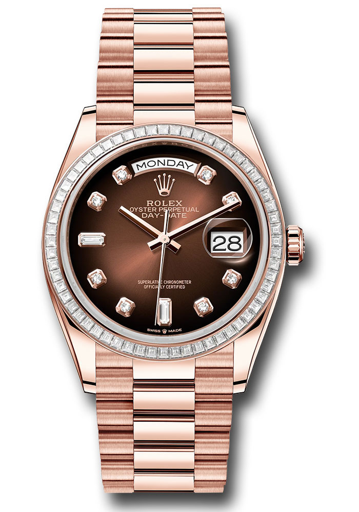 36mm 18K Everose gold case, screw-down back, screw-down crown with twinlock double waterproofness system, diamond bezel, scratch-resistant sapphire crystal with cyclops lens over the date, brown ombré dial, diamond hour markers and baguette-cut diamonds at 6 and 9 o'clock, Rolex calibre 3255 perpetual self-winding movement with centre hour, minute and seconds hands, instantaneous day and date in apertures, secure rapid-setting, and stop-seconds for exact time setting, approximately 70 hours of power reserve, President bracelet with semi-circular three-piece links, concealed folding Crownclasp buckle. Waterproof to 100 metres / 330 feet.