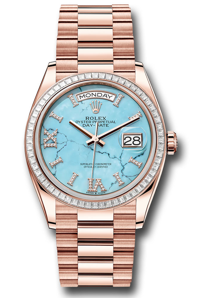 36mm 18K Everose gold case, screw-down back, screw-down crown with twinlock double waterproofness system, diamond bezel, scratch-resistant sapphire crystal with cyclops lens over the date, turquoise dial, index hour markers set with 32 diamonds and Roman VI and IX set with 24 diamonds, Rolex calibre 3255 perpetual self-winding movement with centre hour, minute and seconds hands, instantaneous day and date in apertures, secure rapid-setting, and stop-seconds for exact time setting, approximately 70 hours of power reserve, President bracelet with semi-circular three-piece links, concealed folding Crownclasp buckle. Waterproof to 100 metres / 330 feet.
