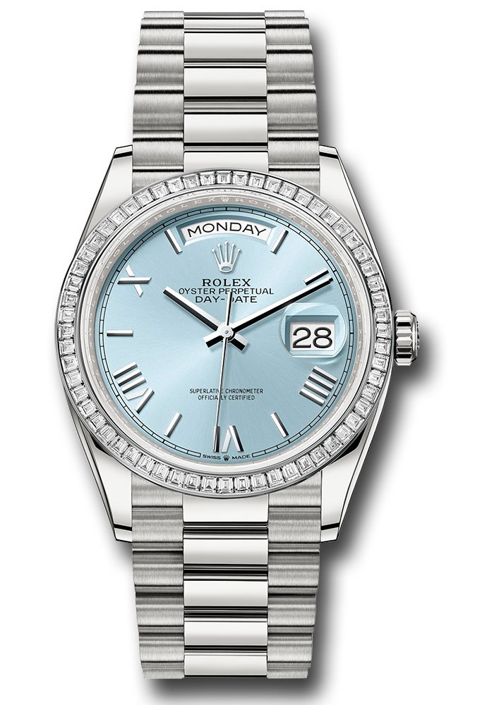 36mm platinum case, screw-down back, screw-down crown with twinlock double waterproofness system, diamond bezel, scratch-resistant sapphire crystal with cyclops lens over the date, ice blue dial, bevelled deconstructed Roman numerals, Rolex calibre 3255 perpetual self-winding movement with centre hour, minute and seconds hands, instantaneous day and date in apertures, secure rapid-setting, and stop-seconds for exact time setting, approximately 70 hours of power reserve, President bracelet with semi-circular three-piece links, concealed folding Crownclasp buckle. Waterproof to 100 metres / 330 feet.