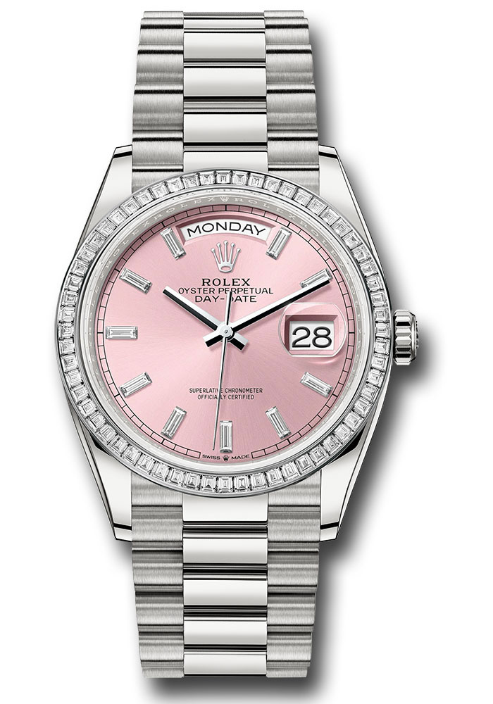 36mm platinum case, screw-down back, screw-down crown with twinlock double waterproofness system, diamond bezel, scratch-resistant sapphire crystal with cyclops lens over the date, pink dial, 10 baguette-cut hour markers, Rolex calibre 3255 perpetual self-winding movement with centre hour, minute and seconds hands, instantaneous day and date in apertures, secure rapid-setting, and stop-seconds for exact time setting, approximately 70 hours of power reserve, President bracelet with semi-circular three-piece links, concealed folding Crownclasp buckle. Waterproof to 100 metres / 330 feet.