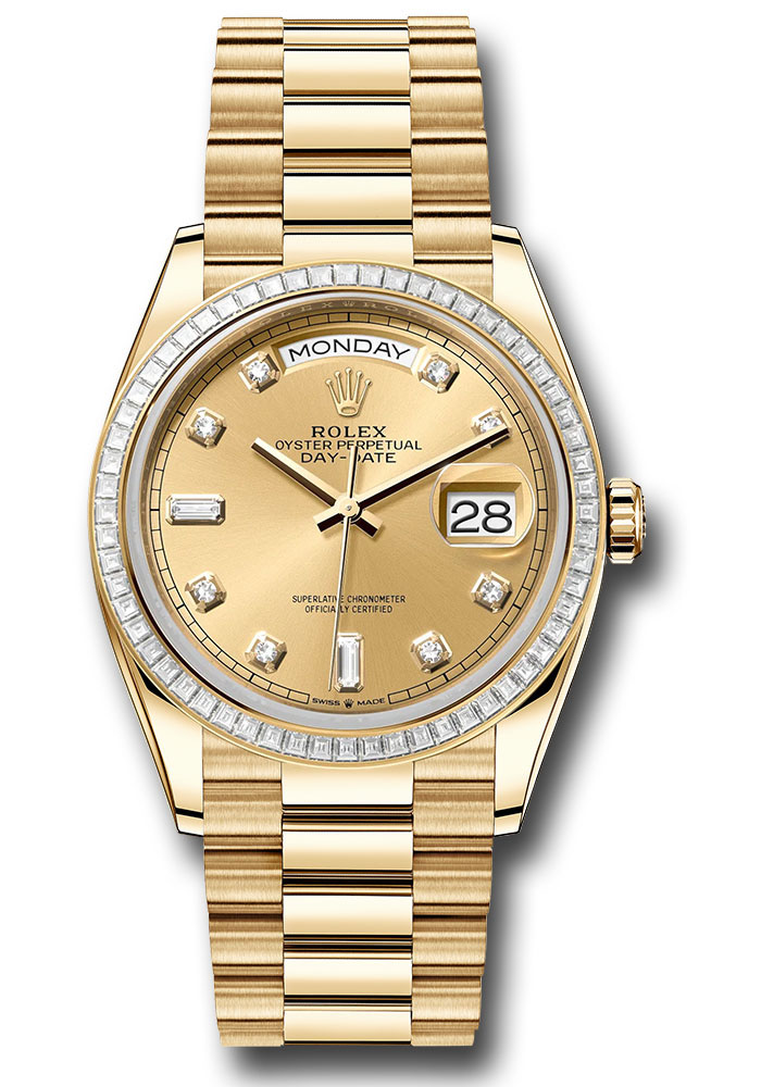 36mm 18K yellow gold case, screw-down back, screw-down crown with twinlock double waterproofness system, diamond bezel, scratch-resistant sapphire crystal with cyclops lens over the date, champagne dial, diamond hour markers and baguette-cut diamonds at 6 and 9 o'clock, Rolex calibre 3255 perpetual self-winding movement with centre hour, minute and seconds hands, instantaneous day and date in apertures, secure rapid-setting, and stop-seconds for exact time setting, approximately 70 hours of power reserve, President bracelet with semi-circular three-piece links, concealed folding Crownclasp buckle. Waterproof to 100 metres / 330 feet.