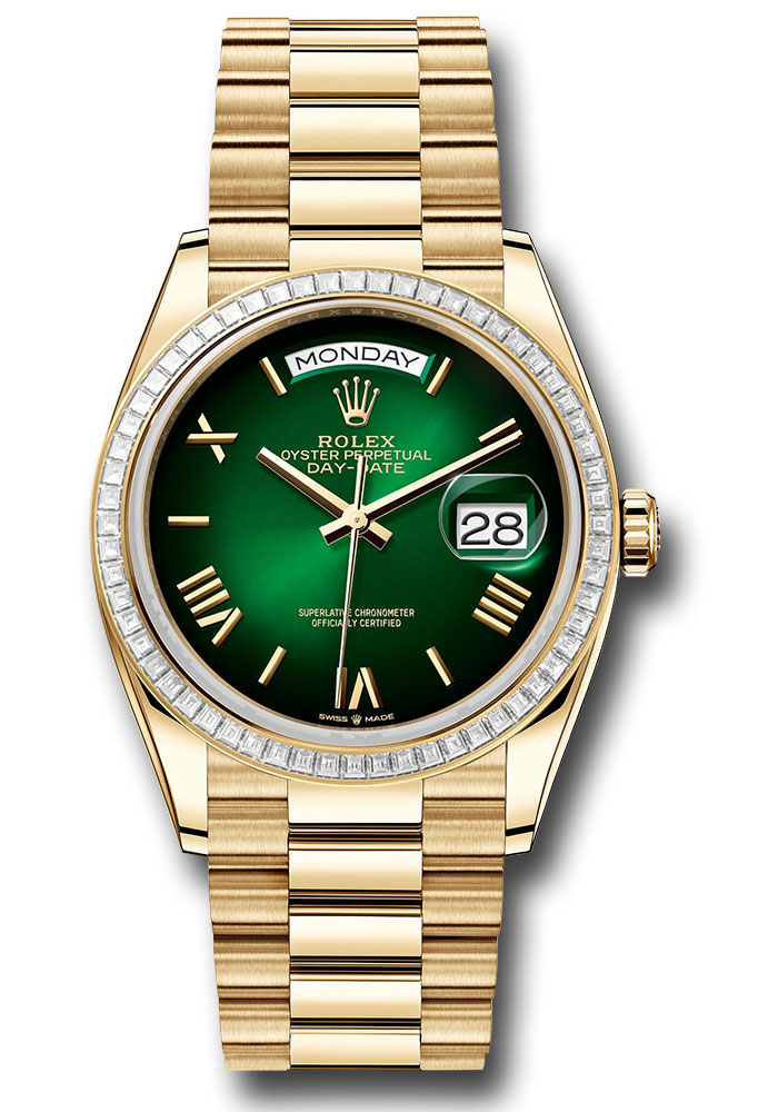 36mm 18K yellow gold case, screw-down back, screw-down crown with twinlock double waterproofness system, diamond bezel, scratch-resistant sapphire crystal with cyclops lens over the date, green ombré dial, bevelled deconstructed Roman numerals, Rolex calibre 3255 perpetual self-winding movement with centre hour, minute and seconds hands, instantaneous day and date in apertures, secure rapid-setting, and stop-seconds for exact time setting, approximately 70 hours of power reserve, President bracelet with semi-circular three-piece links, concealed folding Crownclasp buckle. Waterproof to 100 metres / 330 feet.