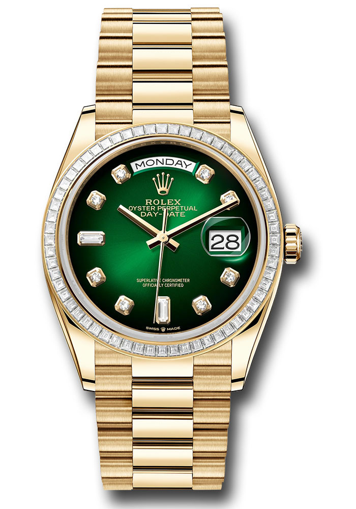 36mm 18K yellow gold case, screw-down back, screw-down crown with twinlock double waterproofness system, diamond bezel, scratch-resistant sapphire crystal with cyclops lens over the date, green ombré dial, diamond hour markers and baguette-cut diamonds at 6 and 9 o'clock, Rolex calibre 3255 perpetual self-winding movement with centre hour, minute and seconds hands, instantaneous day and date in apertures, secure rapid-setting, and stop-seconds for exact time setting, approximately 70 hours of power reserve, President bracelet with semi-circular three-piece links, concealed folding Crownclasp buckle. Waterproof to 100 metres / 330 feet.