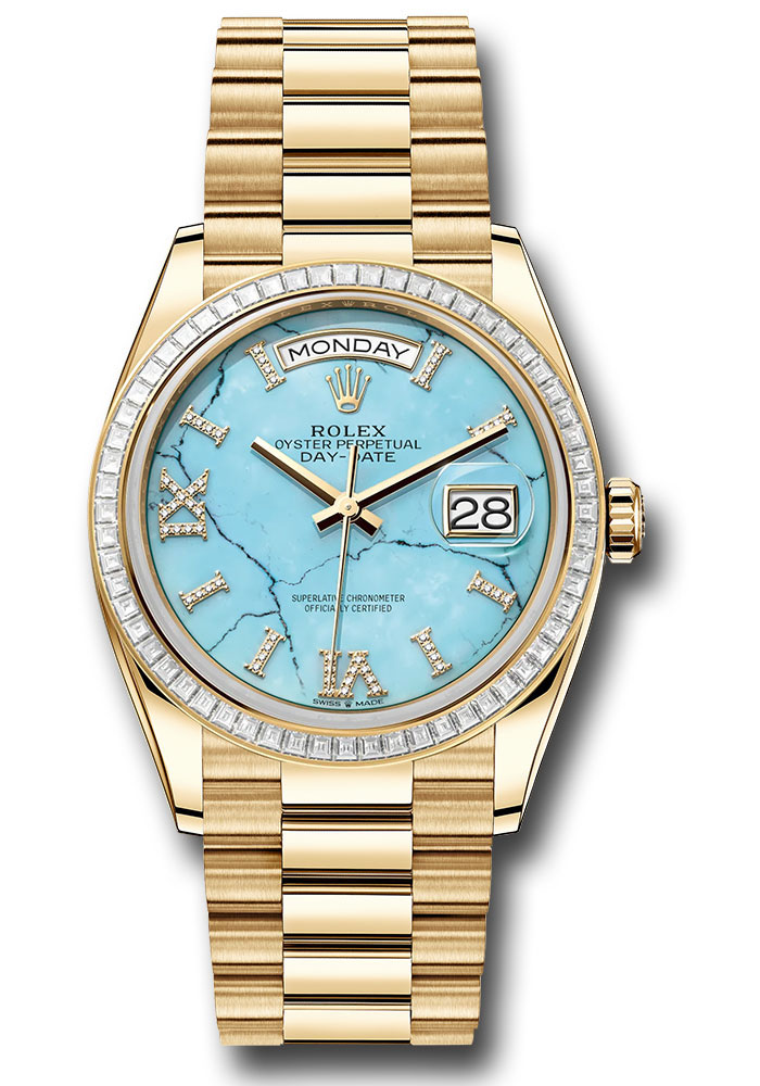 36mm 18K yellow gold case, screw-down back, screw-down crown with twinlock double waterproofness system, diamond bezel, scratch-resistant sapphire crystal with cyclops lens over the date, turquoise dial, index hour markers set with 32 diamonds and Roman VI and IX set with 24 diamonds, Rolex calibre 3255 perpetual self-winding movement with centre hour, minute and seconds hands, instantaneous day and date in apertures, secure rapid-setting, and stop-seconds for exact time setting, approximately 70 hours of power reserve, President bracelet with semi-circular three-piece links, concealed folding Crownclasp buckle. Waterproof to 100 metres / 330 feet.