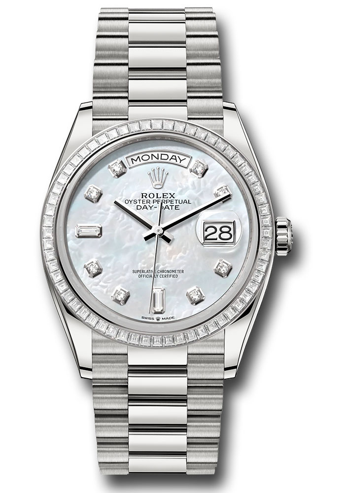 36mm 18K white gold case, screw-down back, screw-down crown with twinlock double waterproofness system, diamond bezel, scratch-resistant sapphire crystal with cyclops lens over the date, white mother-of-pearl dial, diamond hour markers and baguette-cut diamonds at 6 and 9 o'clock, Rolex calibre 3255 perpetual self-winding movement with centre hour, minute and seconds hands, instantaneous day and date in apertures, secure rapid-setting, and stop-seconds for exact time setting, approximately 70 hours of power reserve, President bracelet with semi-circular three-piece links, concealed folding Crownclasp buckle. Waterproof to 100 metres / 330 feet.